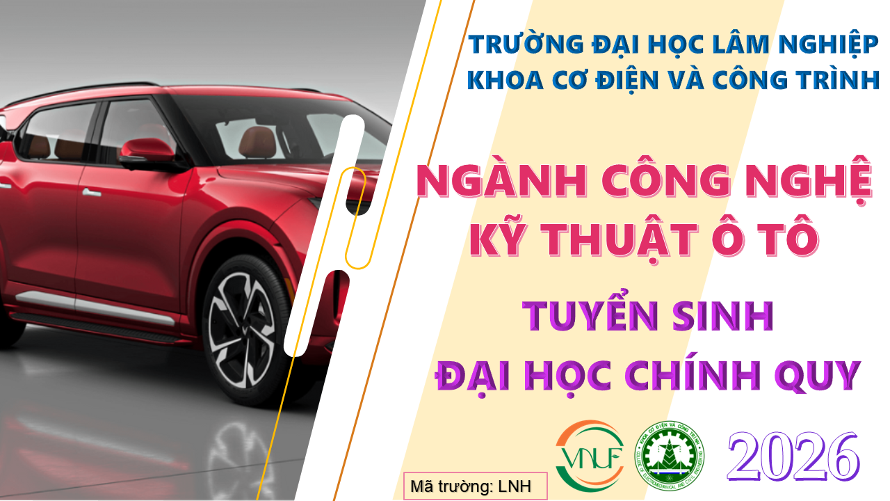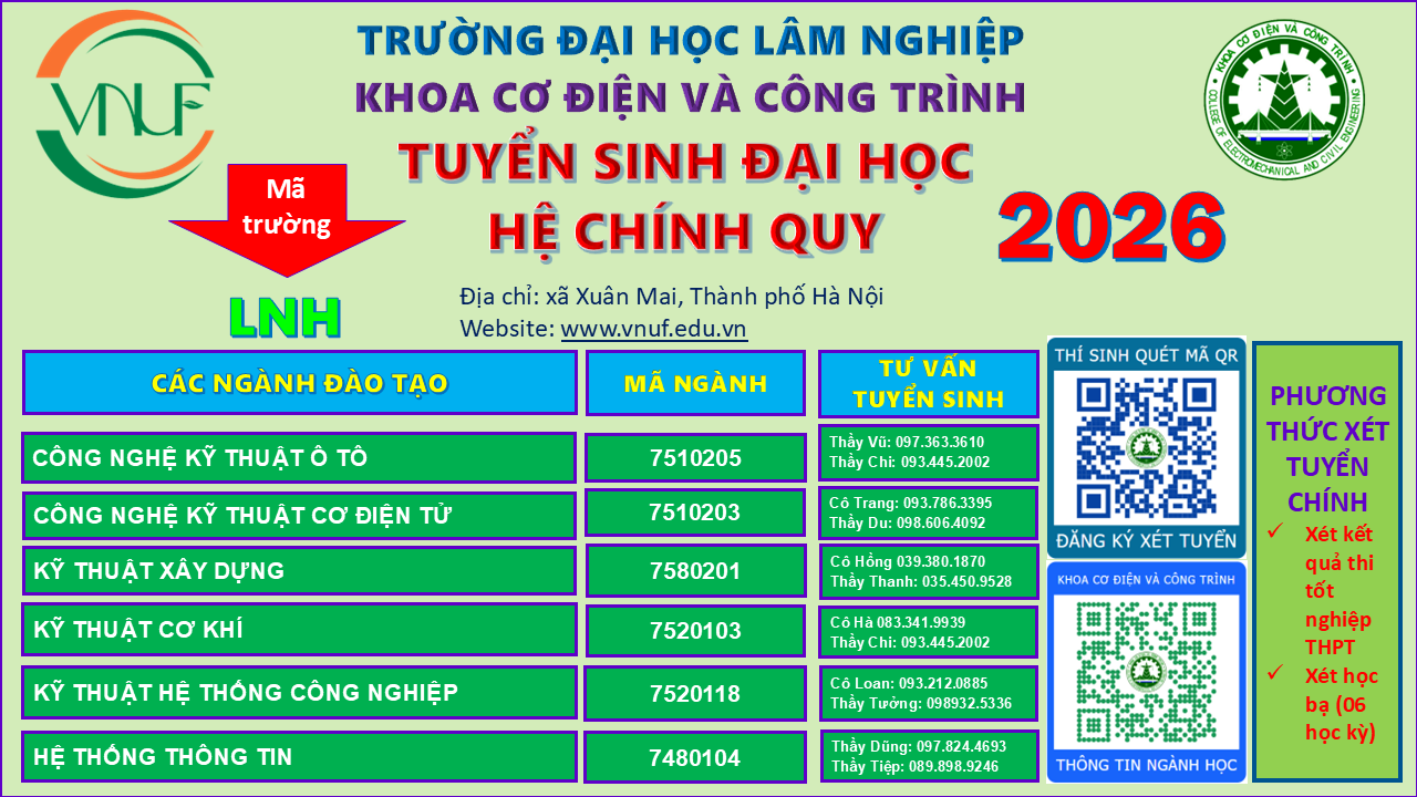 Đọc tiếpKhoa Cơ điện và Công trình - Trường Đại học Lâm nghiệp (VNUF) năm 2026 tuyển sinh 06 ngành bậc đại học (hệ chính quy - tập trung), bao gồm: Công nghệ kỹ thuật ô tô; Công nghệ kỹ thuật cơ điện tử; Kỹ thuật cơ khí (Công nghệ chế tạo máy); Kỹ thuật xây dựng; Kỹ thuật hệ thống công nghiệp; Hệ thống thôn tin (Công nghệ thông tin).